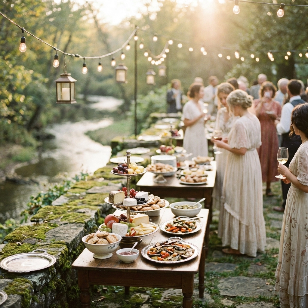 Picture this: beautifully arranged food stations positioned throughout terraced outdoor areas, where guests can grab plates and find charming spots to sit along the creek or under pergolas. This approach automatically reduces per-person costs while creating a relaxed, social atmosphere where people actually mingle more.